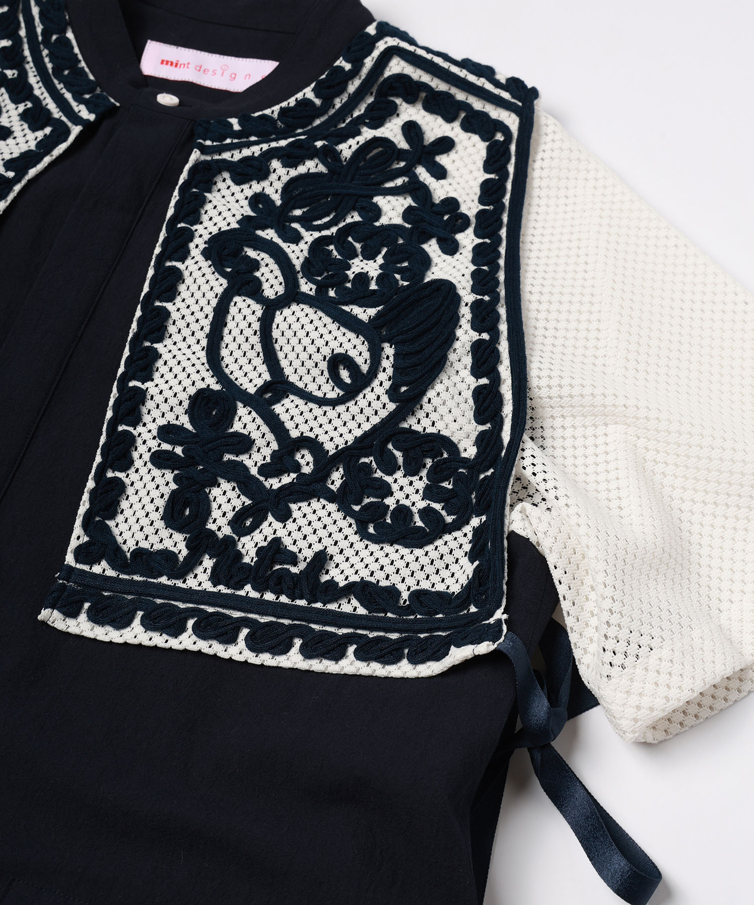 • 採用柔軟的繩線,在網眼布料上進行繩繡加工。