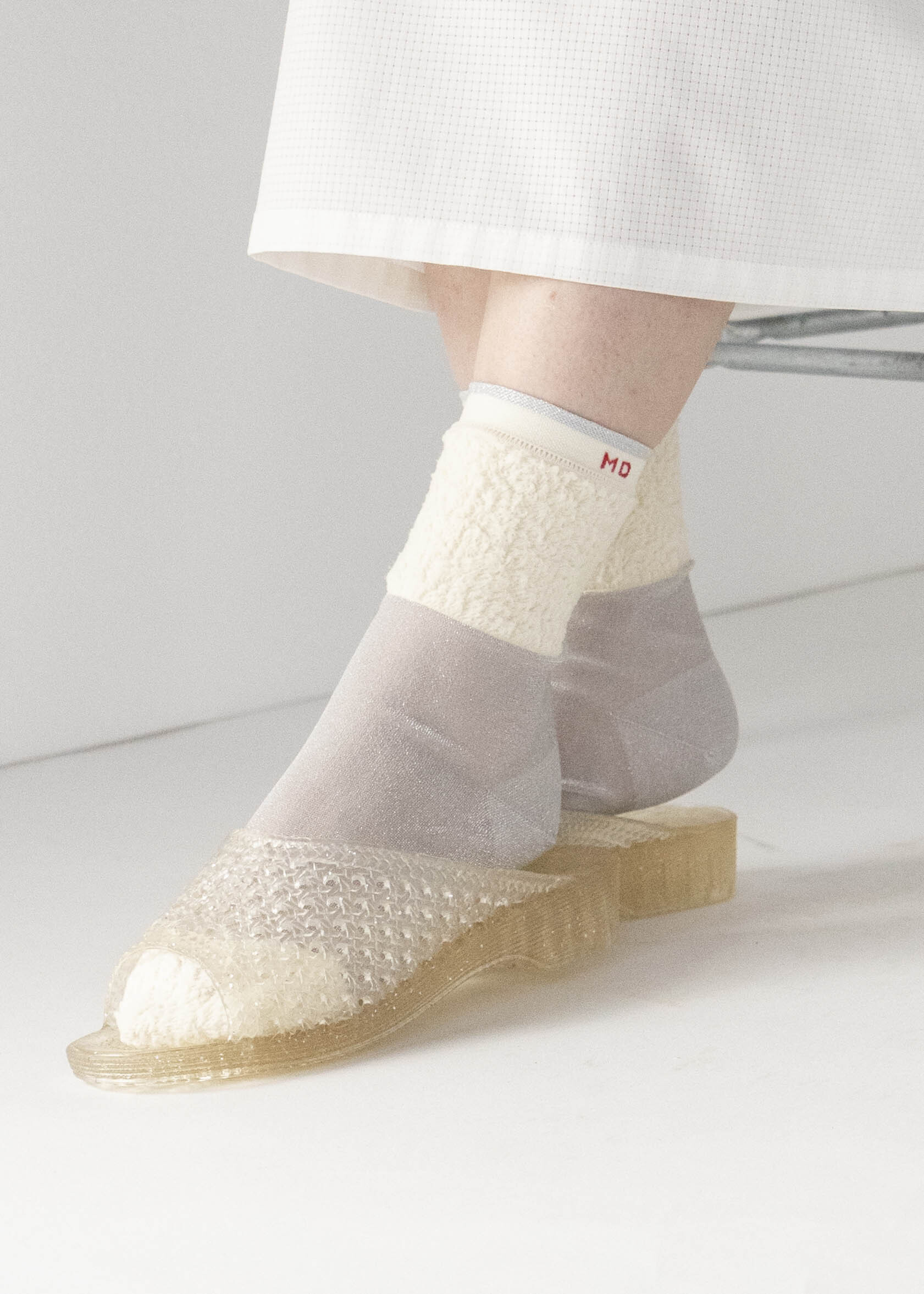 • 襪子的開口和腳趾部分使用蓬鬆紗線,中間部分使用透明紗線